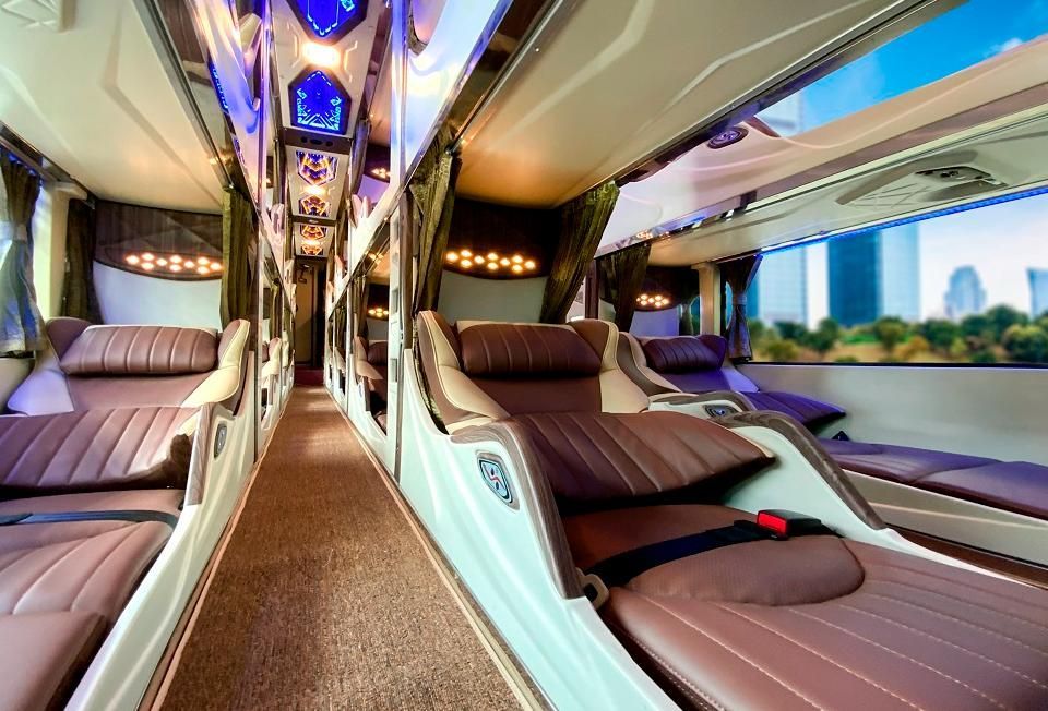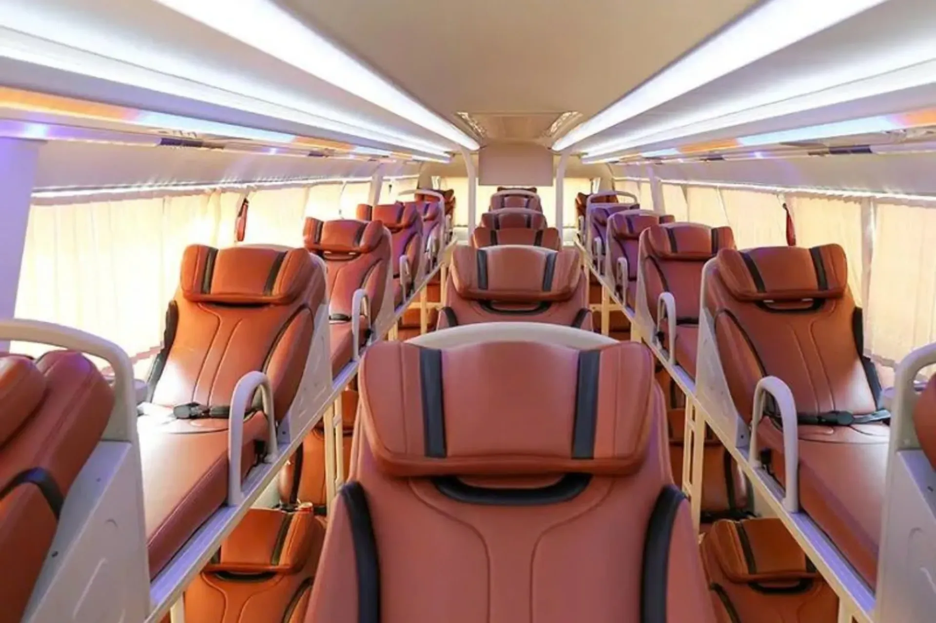 A two-level, three-row bus sharing an open cabin with 40-42 reclining berths.