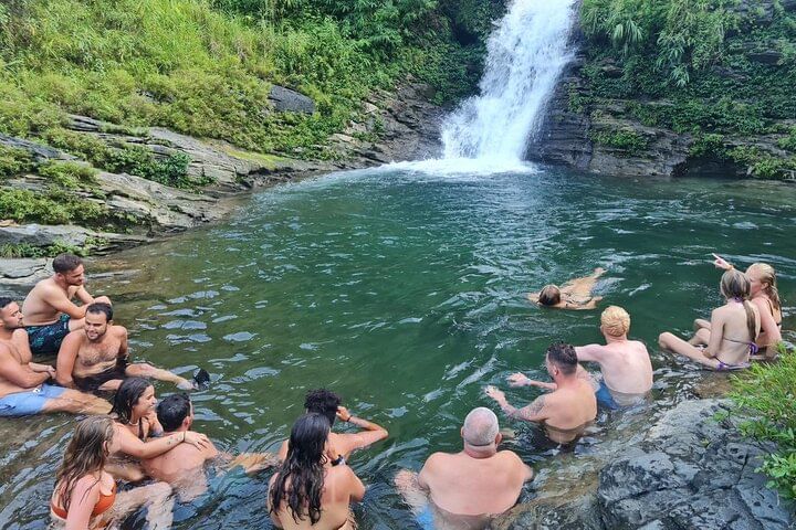 - Diving into the cool embrace of the natural pool beneath Du Gia waterfall