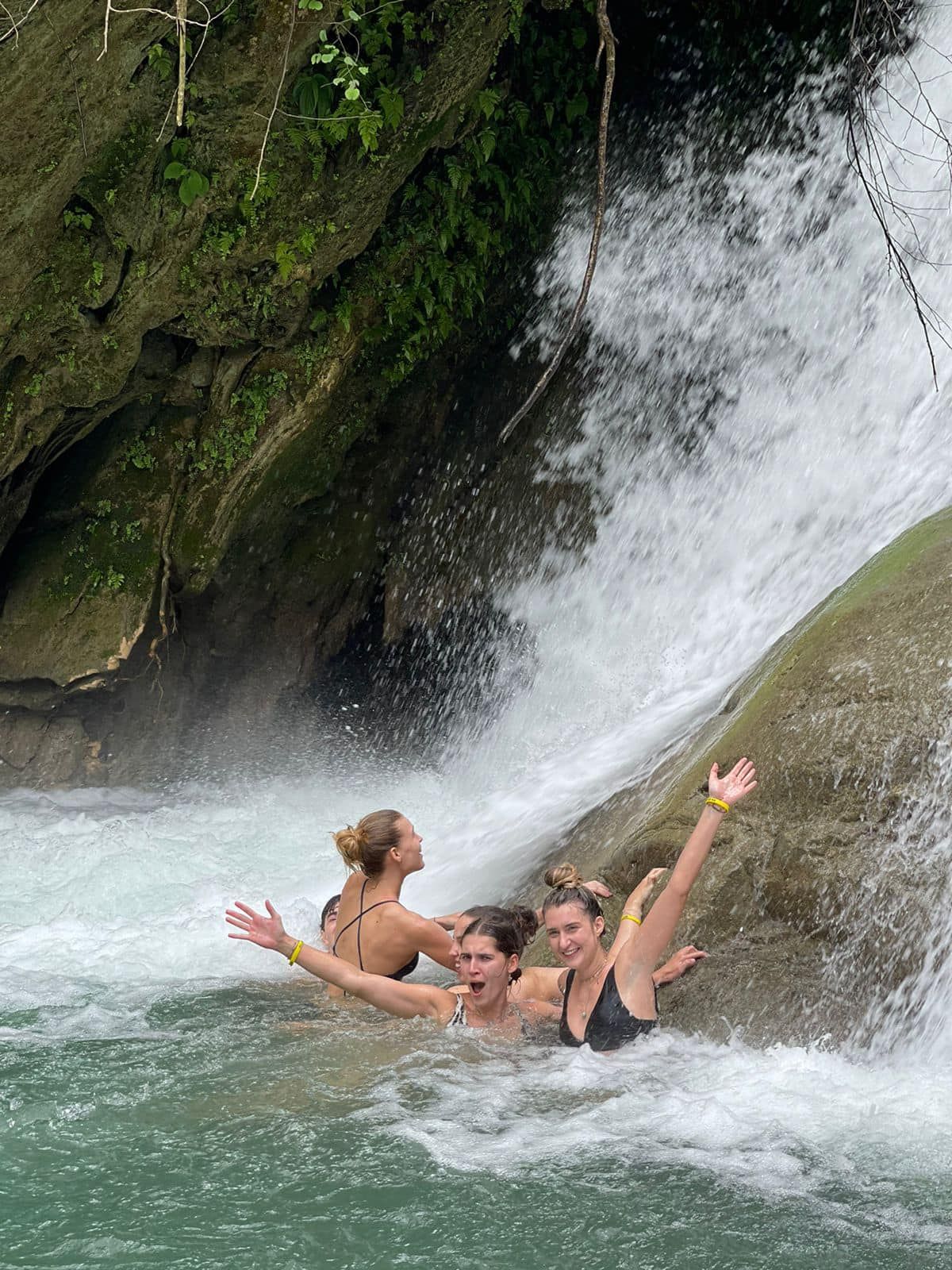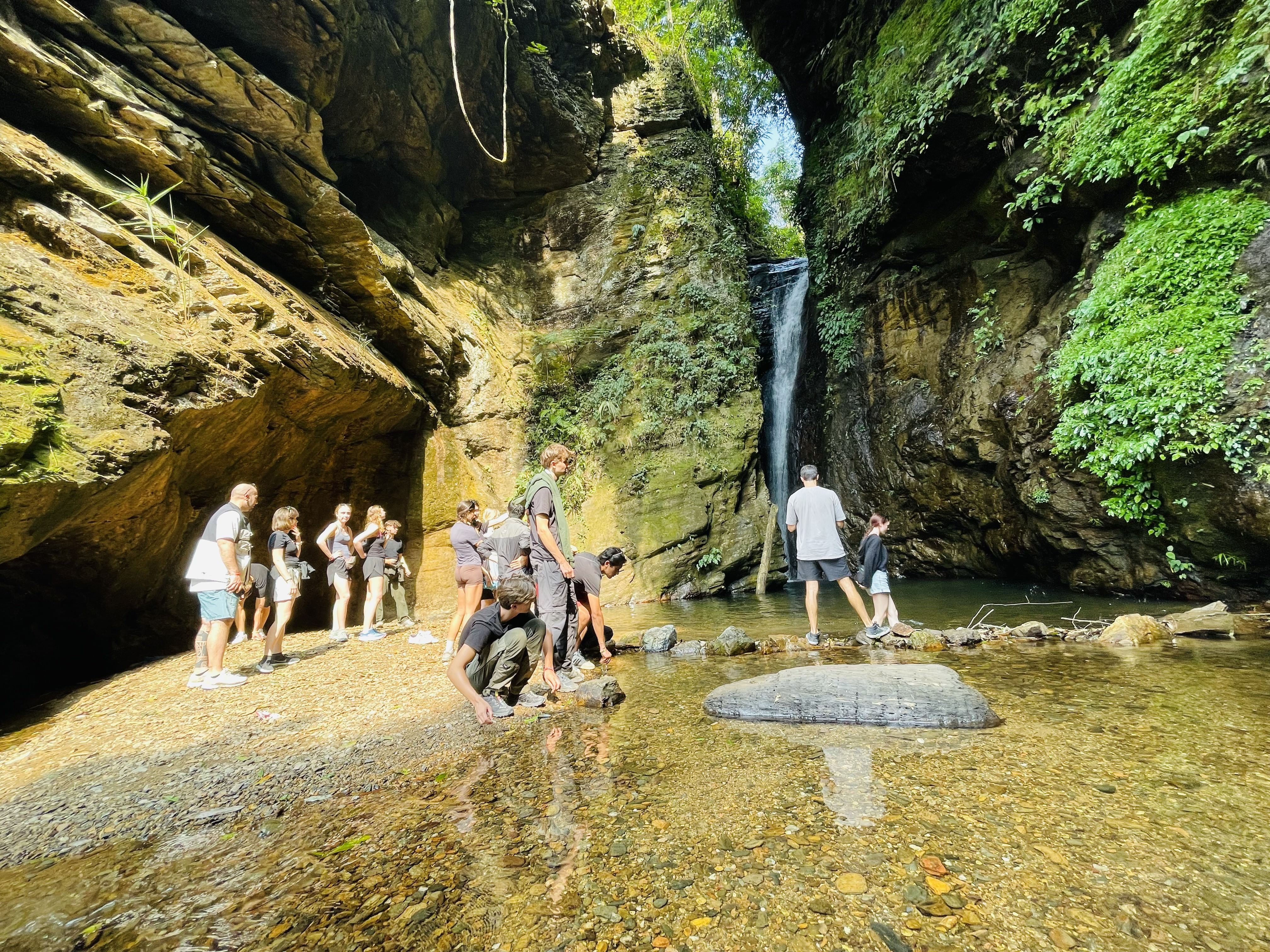 - Diving into the cool embrace of the natural pool beneath Du Gia waterfall