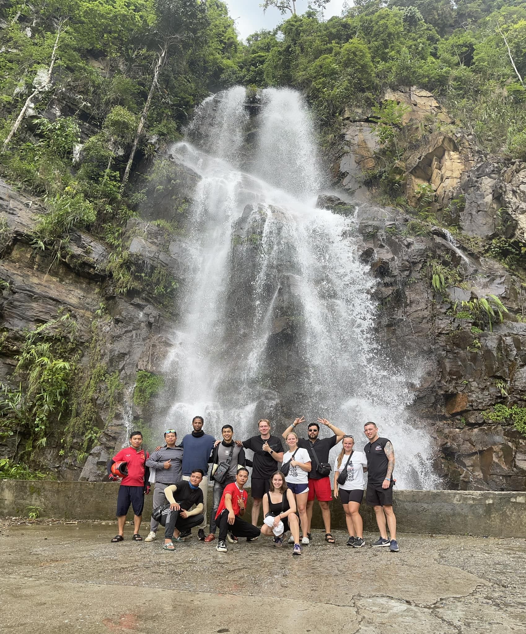 - Diving into the cool embrace of the natural pool beneath Du Gia waterfall