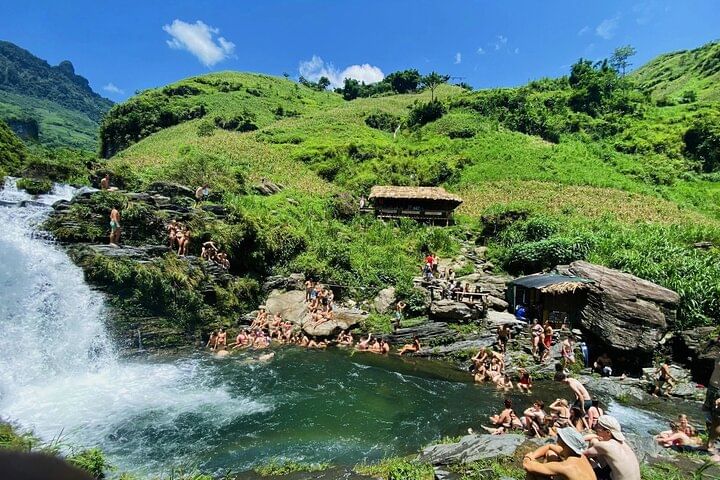 - Diving into the cool embrace of the natural pool beneath Du Gia waterfall