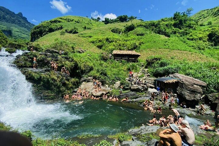 - Diving into the cool embrace of the natural pool beneath Du Gia waterfall